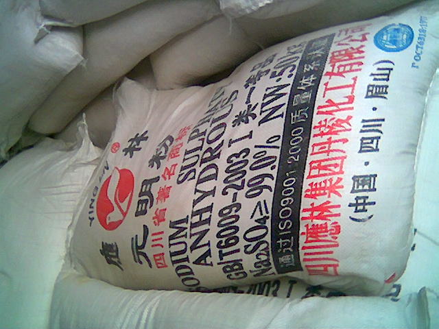 硫酸鈉,無機化合物,又名無水芒硝,白色、無臭、有苦味的結晶或粉末, 有吸濕性。外形為無色、透明、大的結晶或顆粒性小結晶。主要用于制水玻璃、玻璃、瓷釉、紙漿、致冷混合劑、洗滌劑、干燥劑、染料稀釋劑、分析化學試劑、醫(yī)藥品等。 |